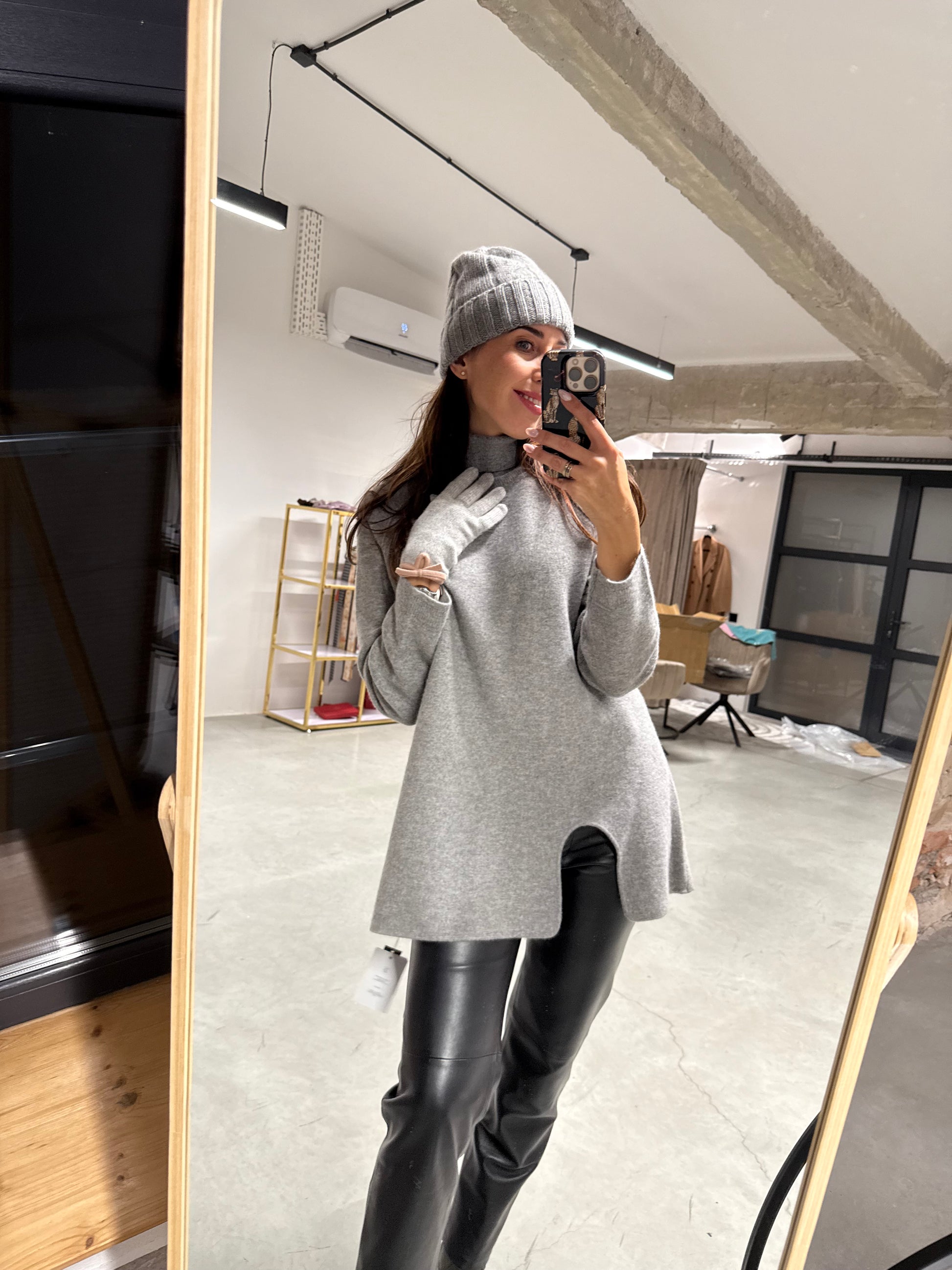 Stilingas, patogus, prailgintas modelis, kuris tiks tiek prie kelnių, tiek prie pieštuko formos sijonų. Skeltukas suteikia žaismingumo. Dydis vienas. Galimos spalvos trys: pieno baltumo, pilka, ruda. Sudėtis: 100% kašmyro vilna. Kilmės šalis Vidinė Mongolija. PRE-ORDER. Užsakymo gavimas per dvi savaites nuo užsakymo Lietuvoje.