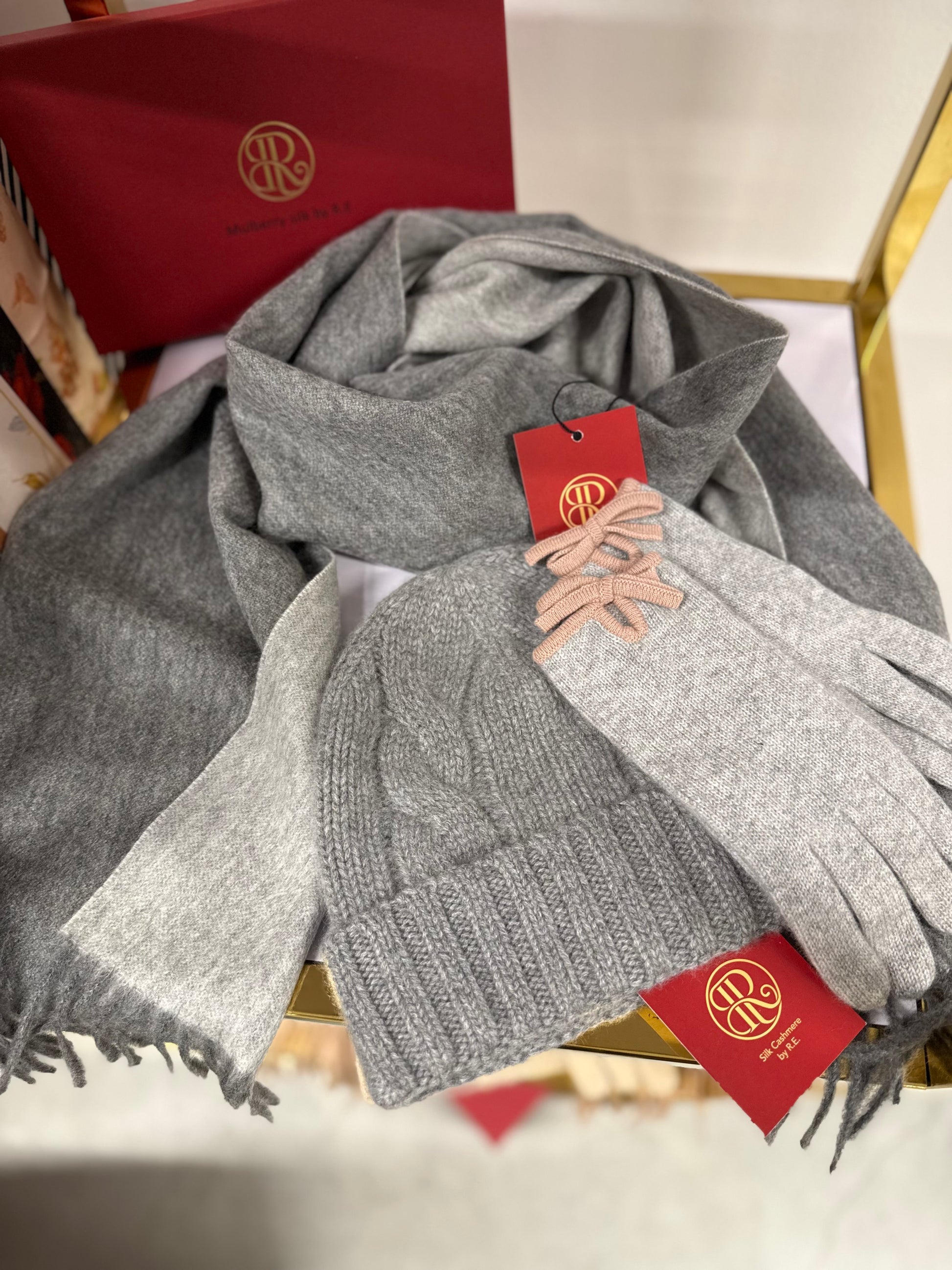 Šį prabangų rinkinį sudaro: dvipusis kašmyro šalis 30x180 dydžio, kašmyro kepurė ir kašmyro pirštinaitės. Šis kašmyro aksesuarų rinkinys puikiai papildys jūsų aprangos eilutę, surteikdamas jai rafinuotumo, elegancijos, žaismingumo prieskonį. Perkant šį rinkinį sutaupote 65 eur, nei perkant prekes atskirai. Sudėtis 100 % kašmyro vilna. Kilmės šalis - Vidinė Mongolija.