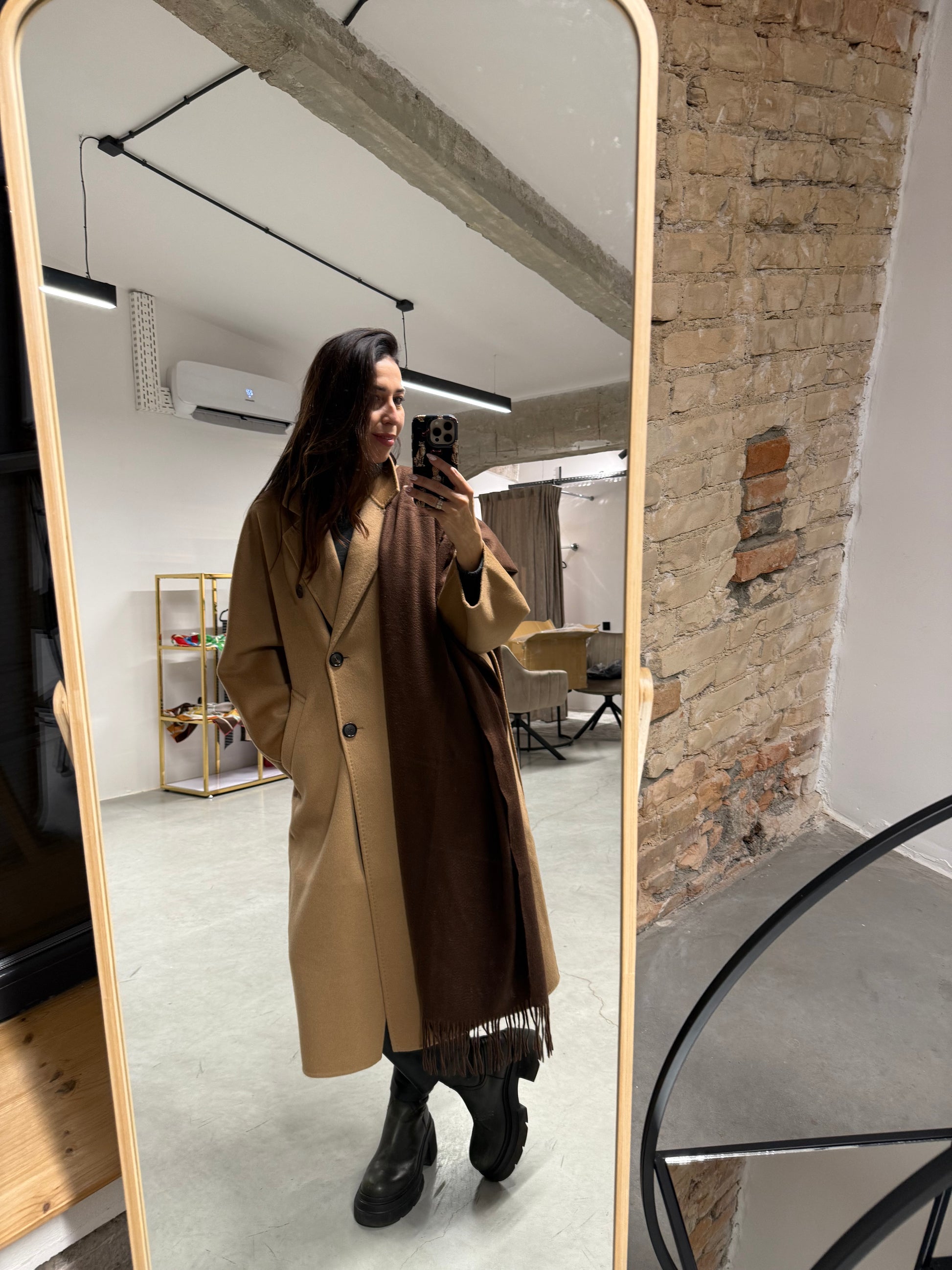 Didelis vienpusis šalikas iš 100 % kašmyro – itin švelnus, purus ir malonus prie odos. Camel spalva pabrėžia minimalizmą ir lengvai derinama tiek su šviesiais, tiek su tamsiais rūbais.