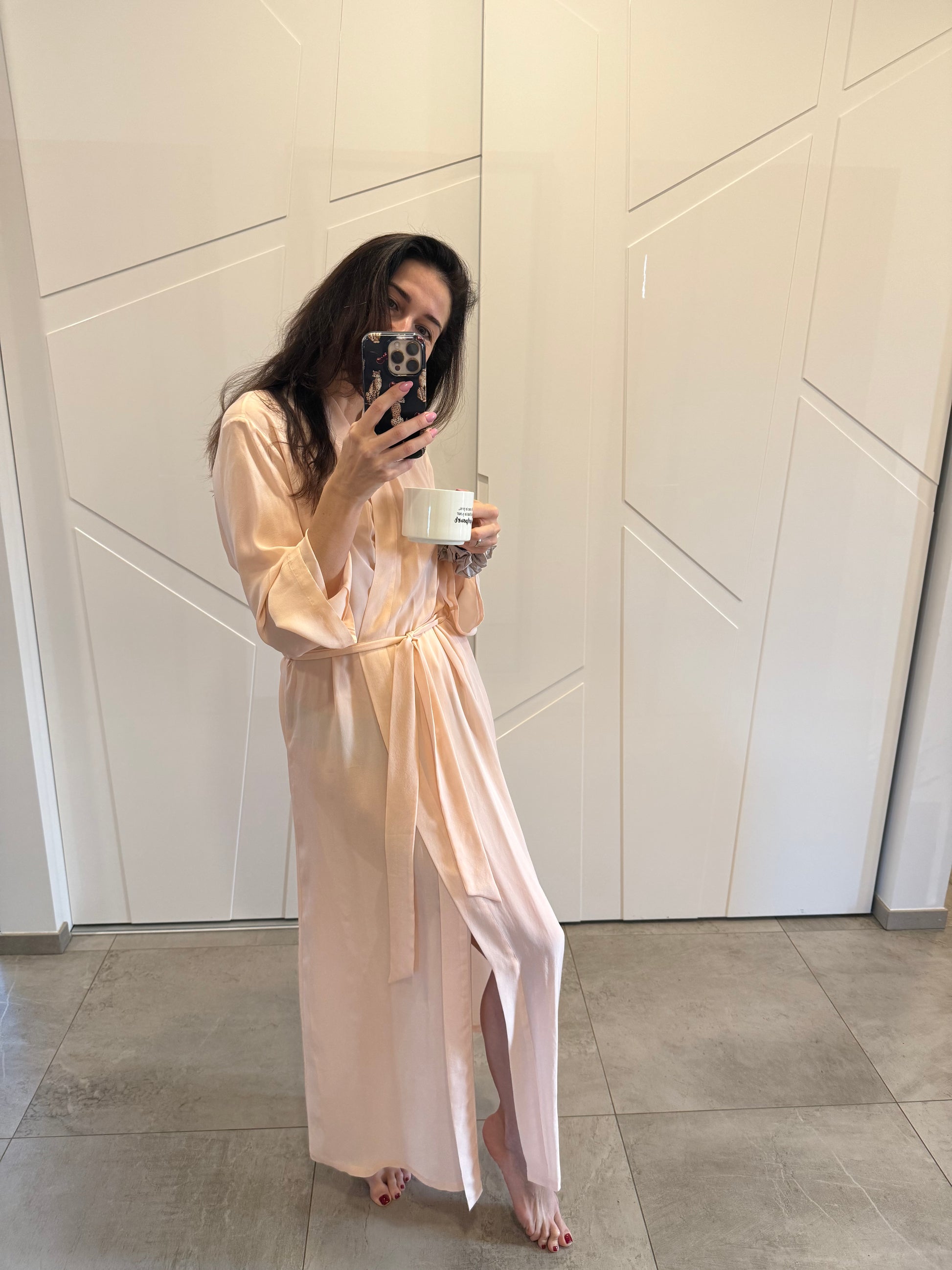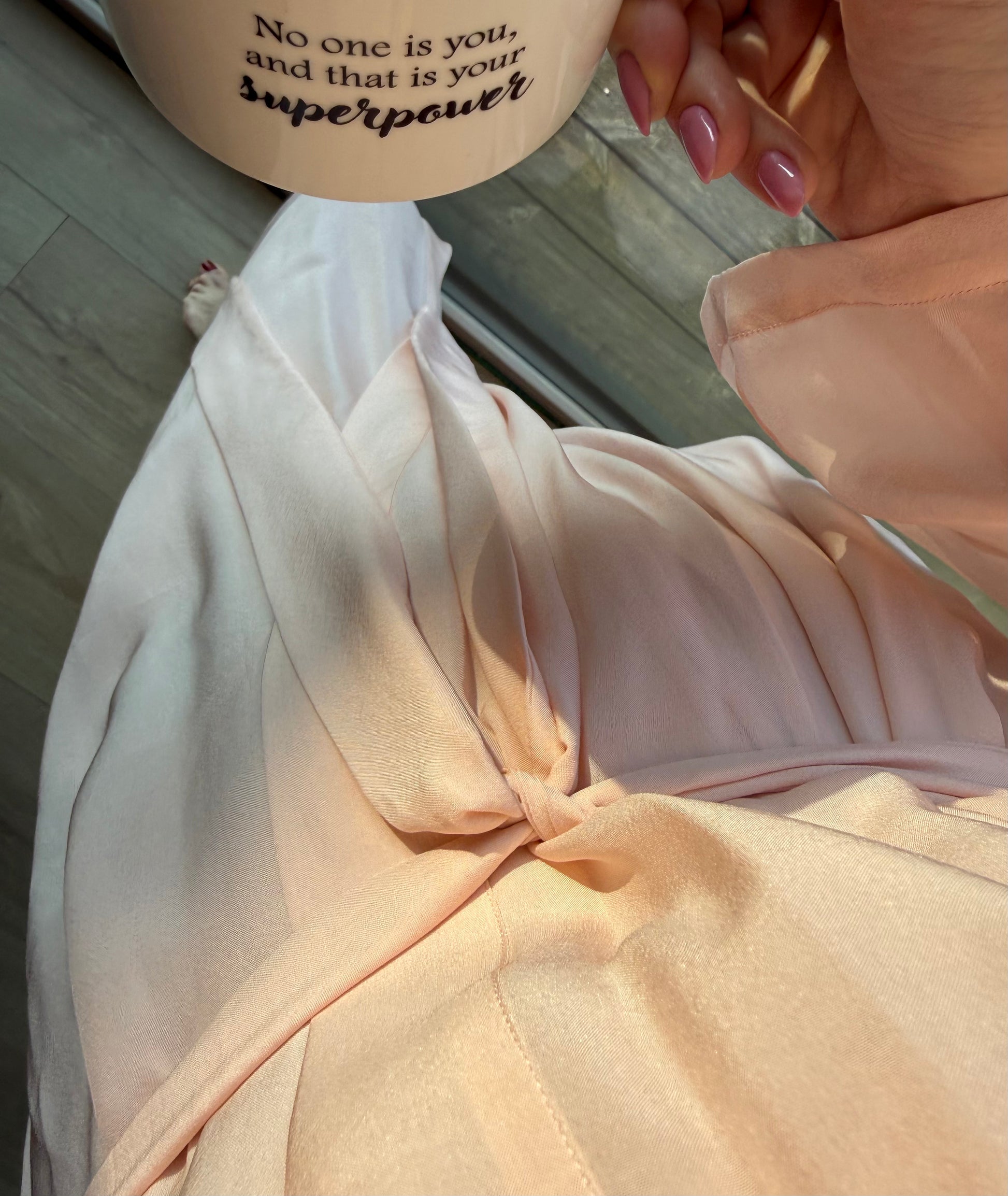 Lengvi, romantiški, perregimi, pastelinių spalvų šilko šifono chalatai/kimono puikiai tiks tiek dėvėti namuose, tiek atostogų metu derint su maudymosi kostiumėliais. Sudėtis 100% 12mm Silk chiffon. Dvi spalvos - švelni mėta, pastelinė rožinė. Dydis vienas: S/M. Ilgis - 140cm.