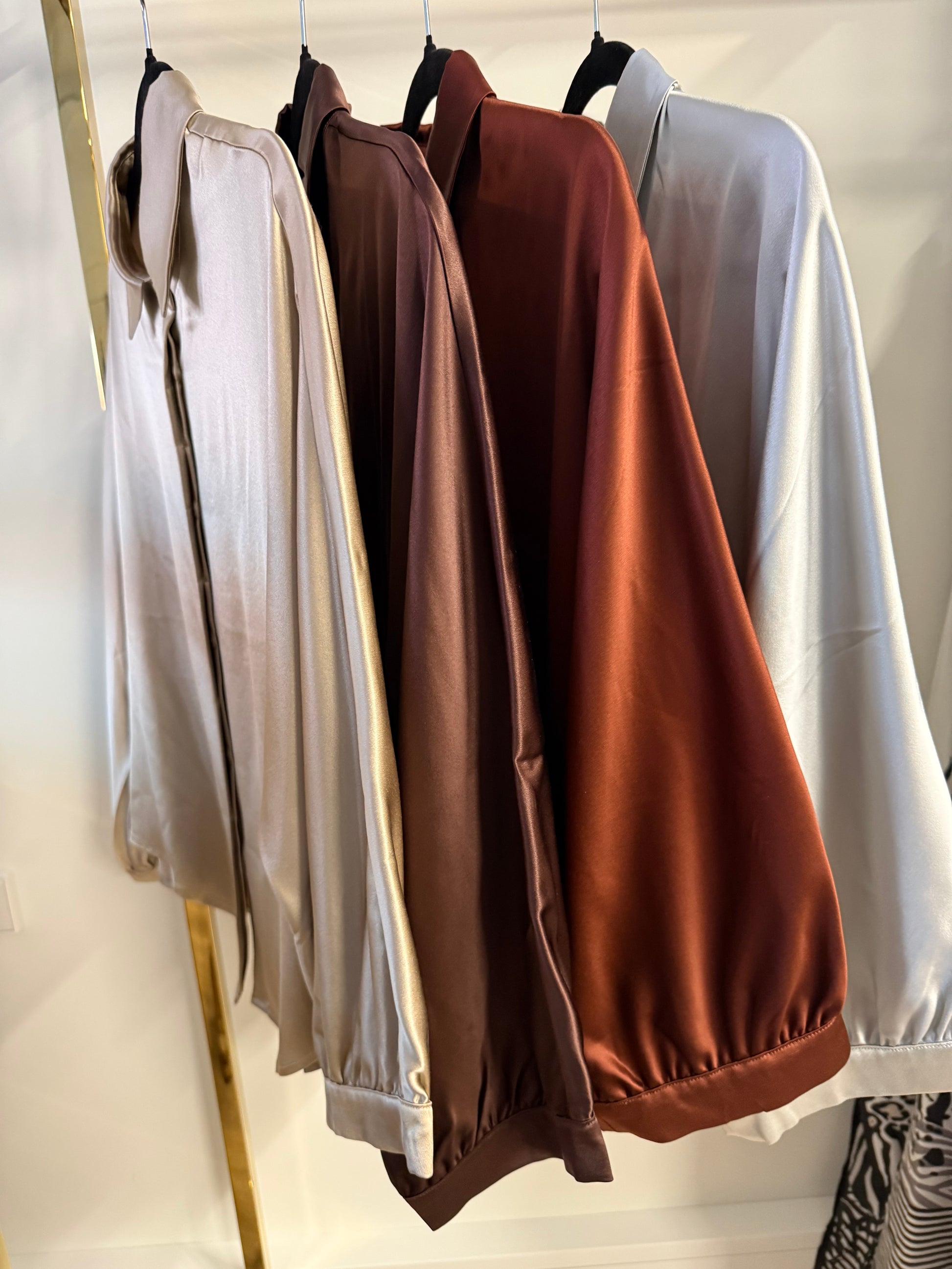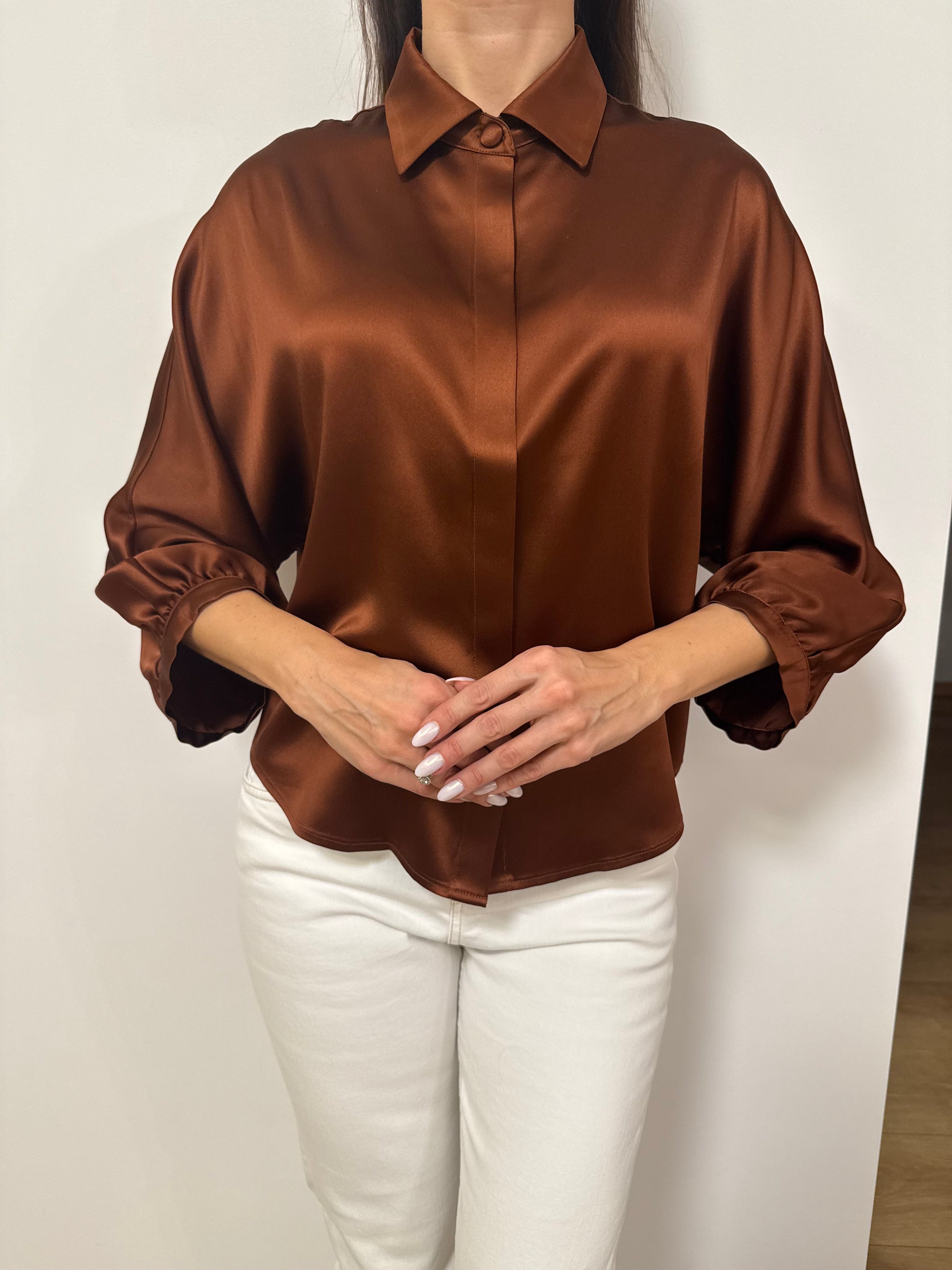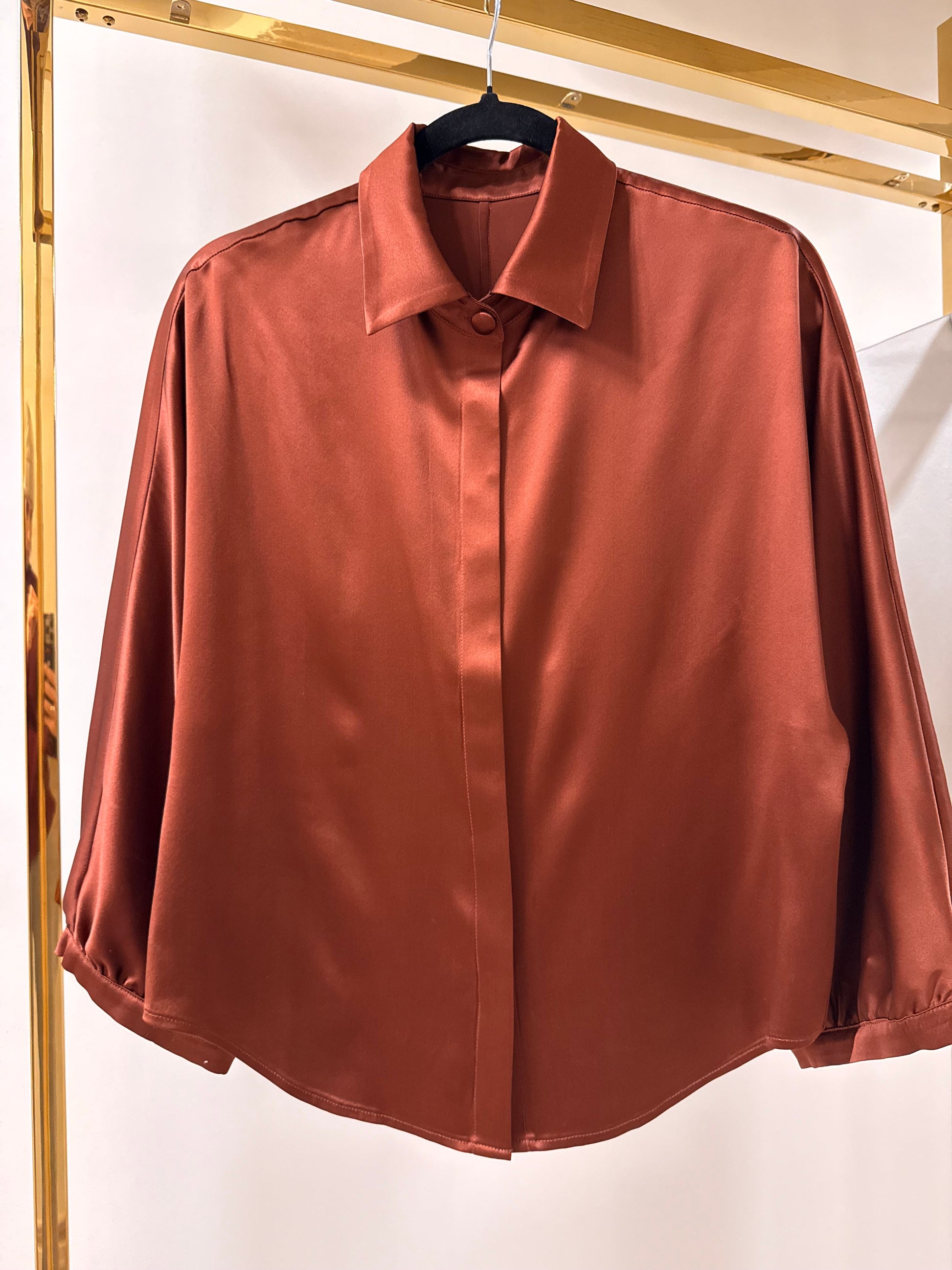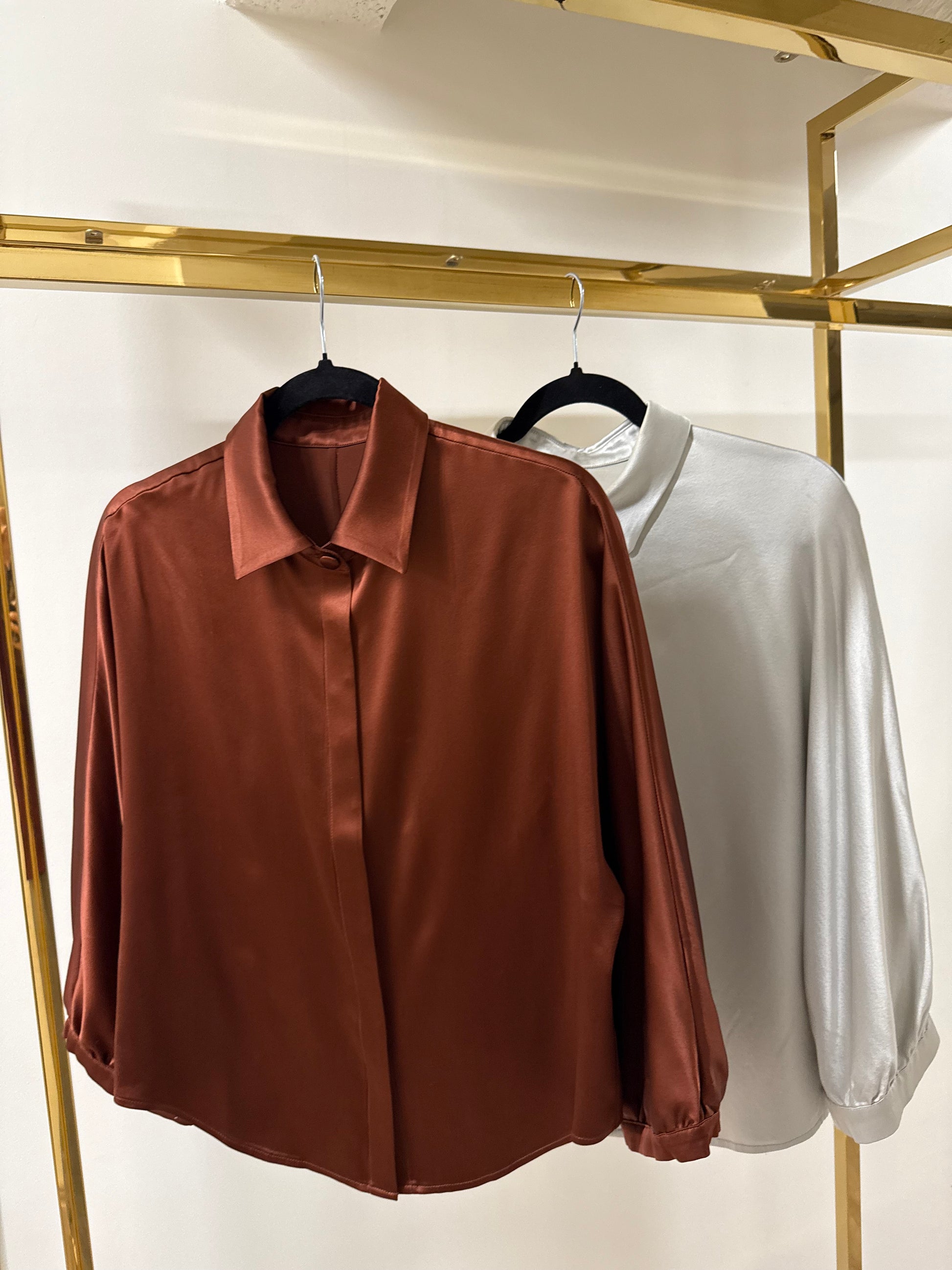 Prabangūs, elegantiški storo šilko marškiniai, kurie nepaliks abejingų. Su jais visada jausitės pasipuošus, ypatingai. Prabangus šilkinis žvilgesys, plačios rankovės, minimalistinis stilius sukuria estetišką, elegantišką ir prabangų įvaizdį. Sudėtis: 100 % Mulberry silk satin, 30 momme. Galimos spalvos 4: vario ruda, tamsaus šokolado, sidabrinė pilka, smėlio. Galimi dydžiai S/M/L, modelis oversize. PRE-ORDER. Gavimas iki Kalėdų. Nuotraukoje varinė ruda ir sidabrinė pilka spalvos, dydis S. S dydžio išmatavimai: marškinių ilgis 64 cm, pečių plotis 42 cm, rankovės ilgis 59cm. M/L dydžiai keliais cm skirias marškinių ilgis, pečių plotis.
