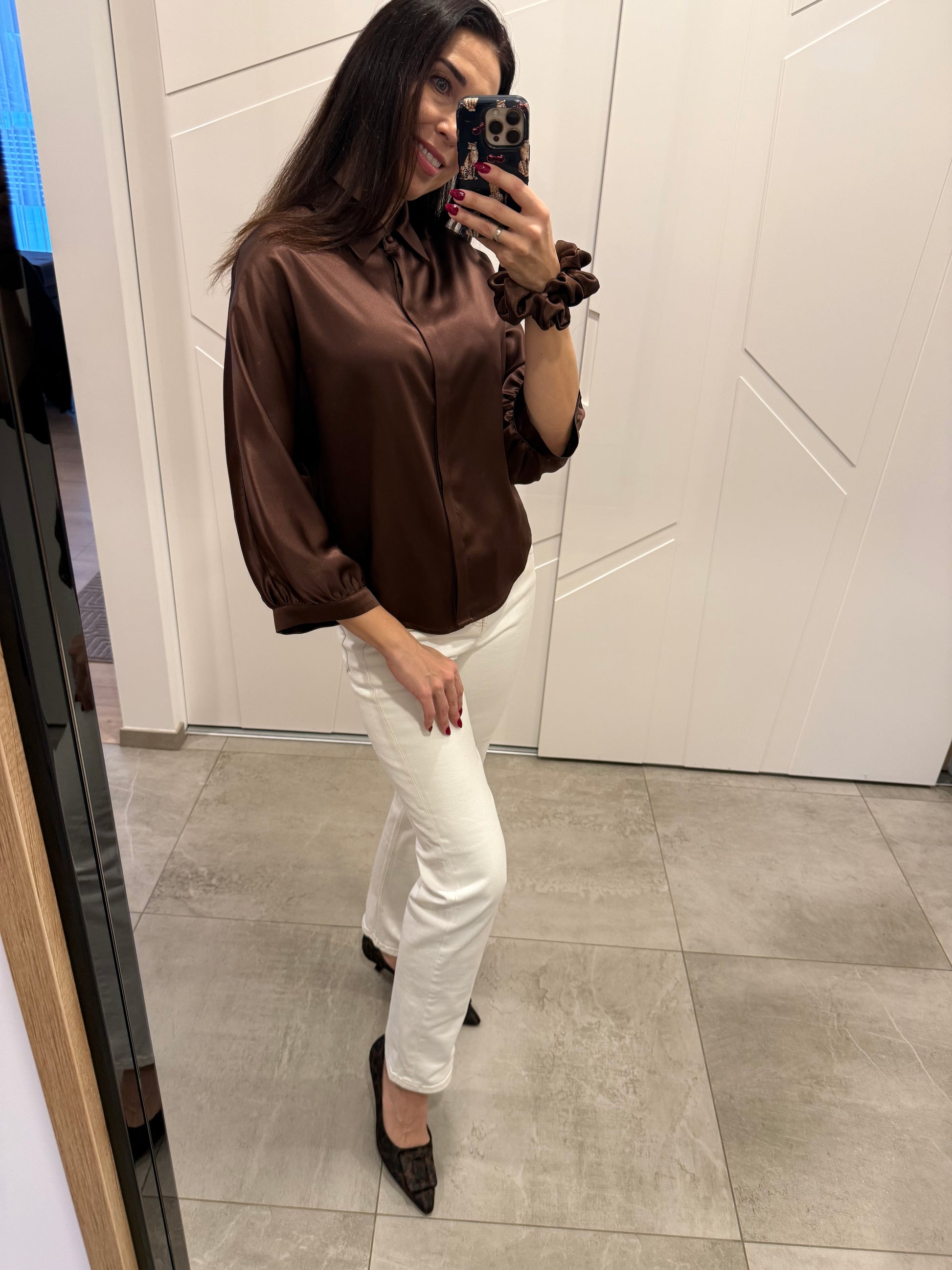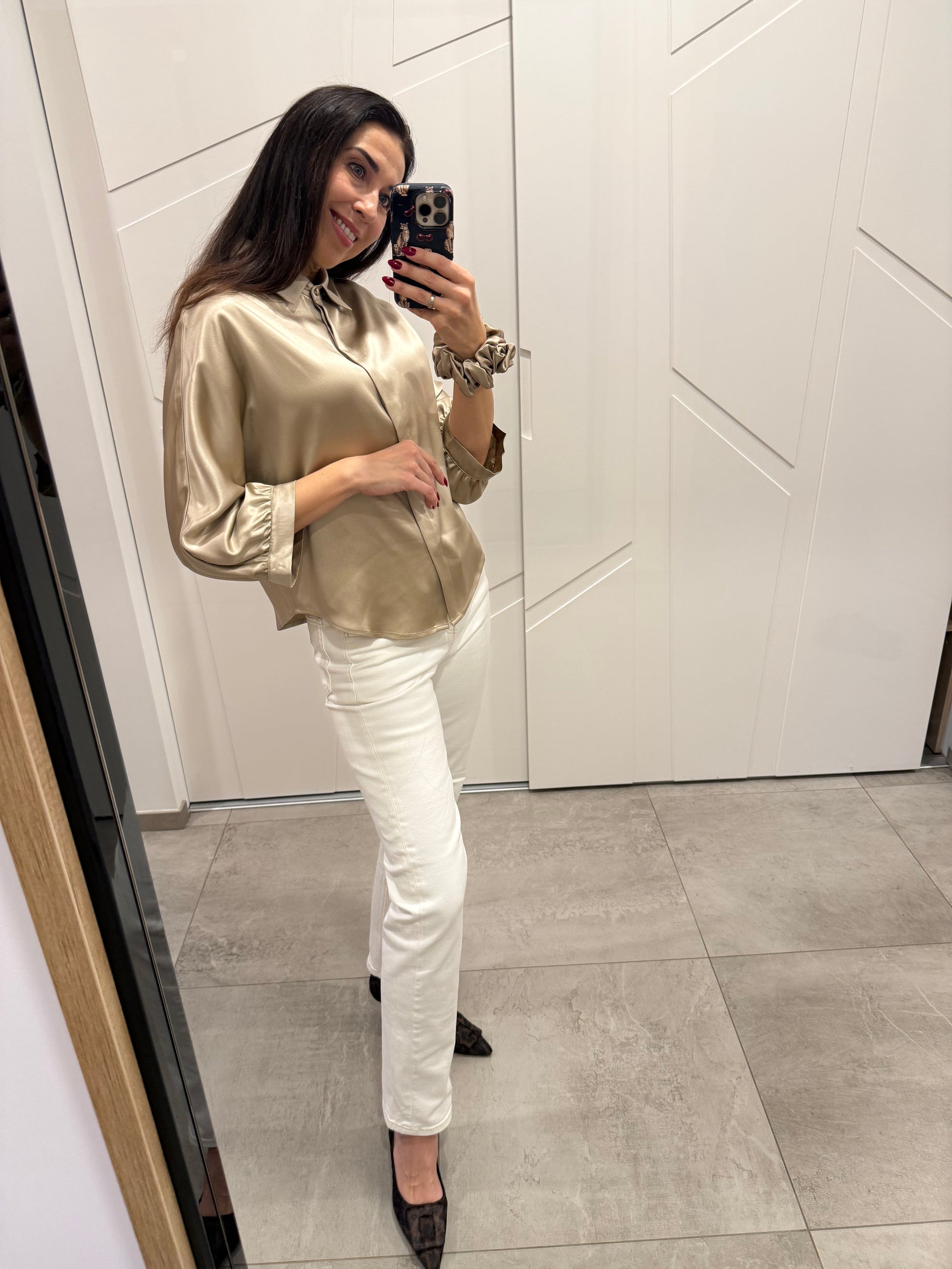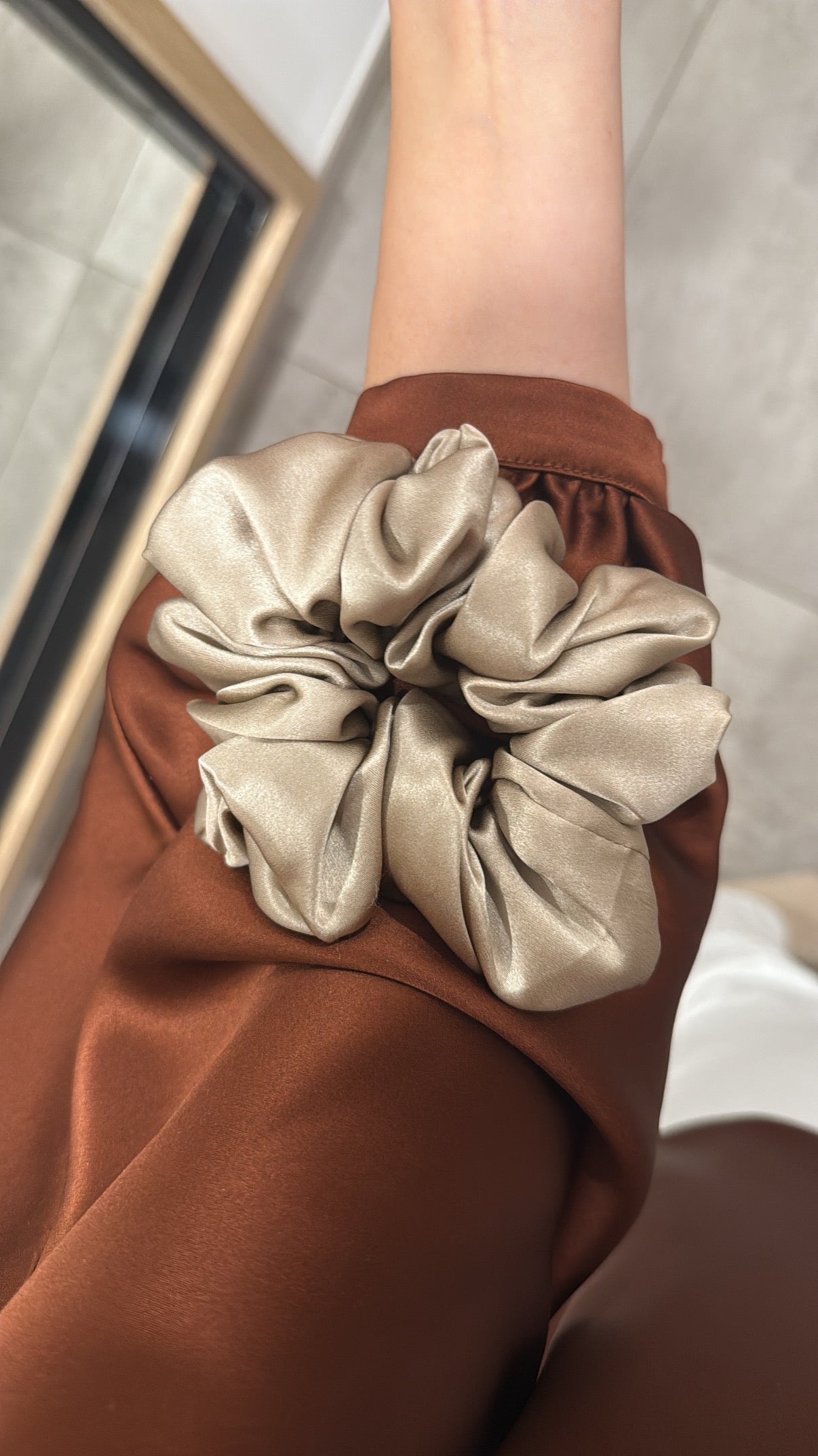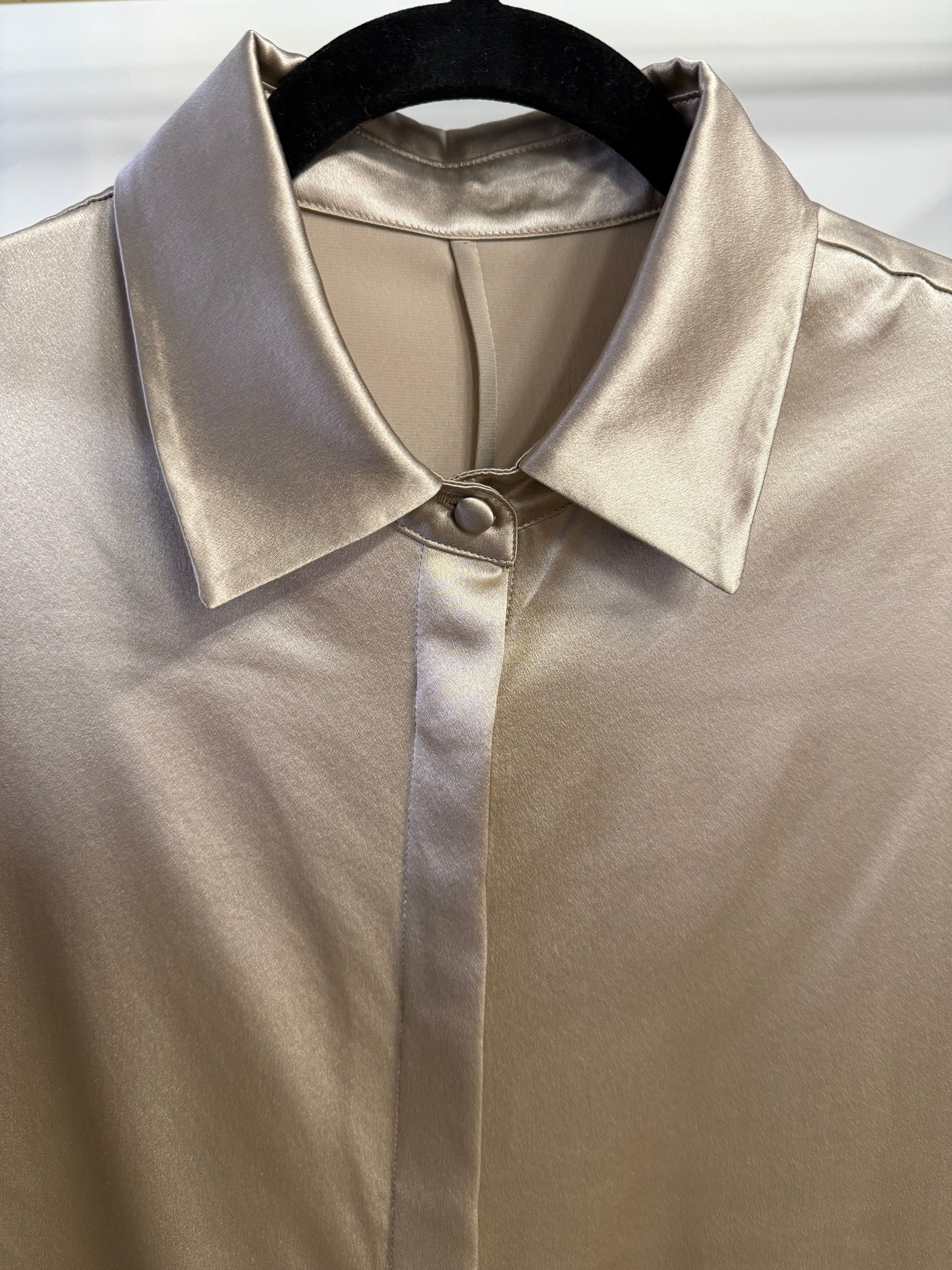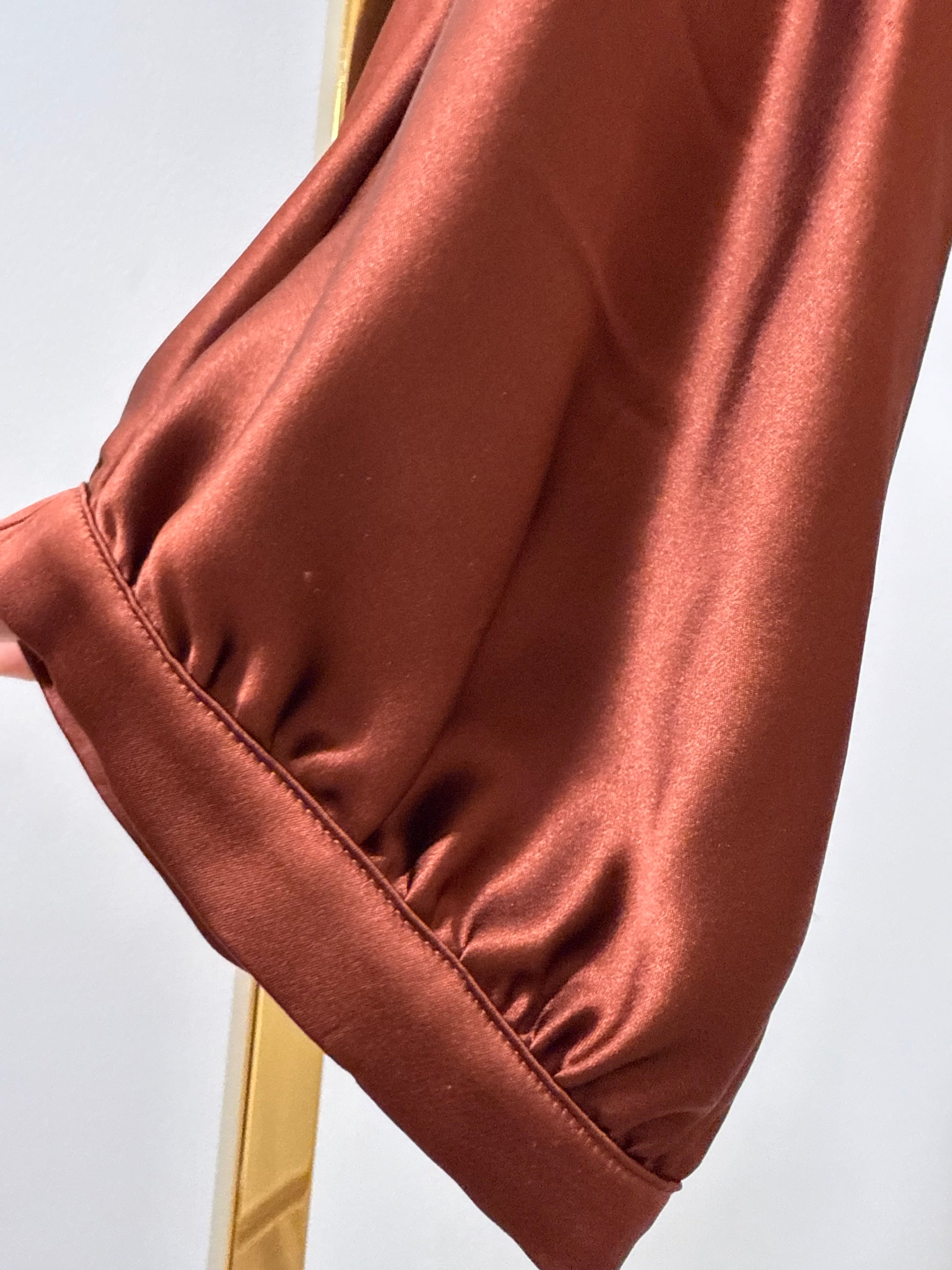 Prabangūs, elegantiški storo šilko marškiniai, kurie nepaliks abejingų. Su jais visada jausitės pasipuošus, ypatingai. Prabangus šilkinis žvilgesys, plačios rankovės, minimalistinis stilius sukuria estetišką, elegantišką ir prabangų įvaizdį. Sudėtis: 100 % Mulberry silk satin, 30 momme. Galimos spalvos 4: vario ruda, tamsaus šokolado, sidabrinė pilka, smėlio. Galimi dydžiai S/M/L, modelis oversize. PRE-ORDER. Gavimas iki Kalėdų. Nuotraukoje varinė ruda ir sidabrinė pilka spalvos, dydis S. S dydžio išmatavimai: marškinių ilgis 64 cm, pečių plotis 42 cm, rankovės ilgis 59cm. M/L dydžiai keliais cm skirias marškinių ilgis, pečių plotis.